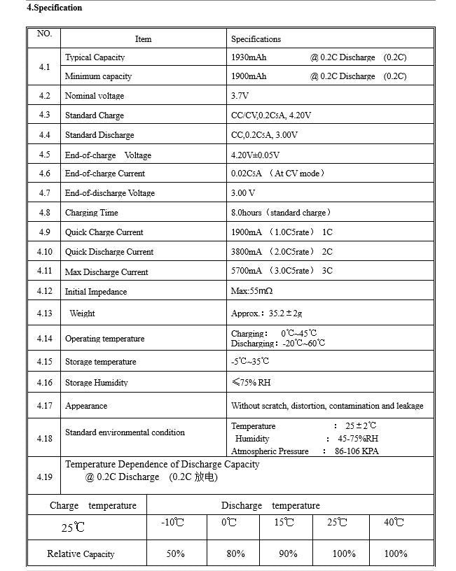 BFN Li-ion aufladbare 18500 1900 mah (3C) Akkuzelle BFN 18500 Akkuzelle ist eine kleine Li-Ion Akkuzelle zur Verwendung in kleinen Akkupacks. Diese Akkuzelle ist UL zertifiziert Technische Daten Kapazität: 1930 mAh (nominal) / 1900 mAh (Min.) Nominale Spannung: 3,6V Ladespannung: 4,2V + 0,05V Entladeschlußspannung: 3V Ladestrom (Max.): 1,9A (1C) Entladestrom...